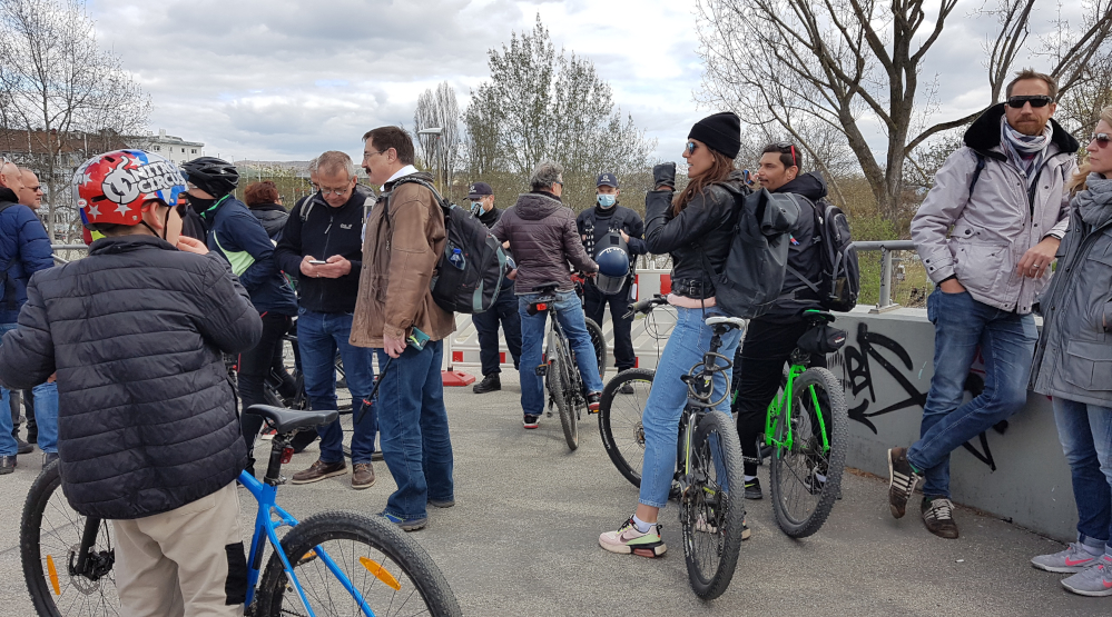Polizei im Geschpräch mit älterer Dame. Ein Ordner hält die Stellung -
